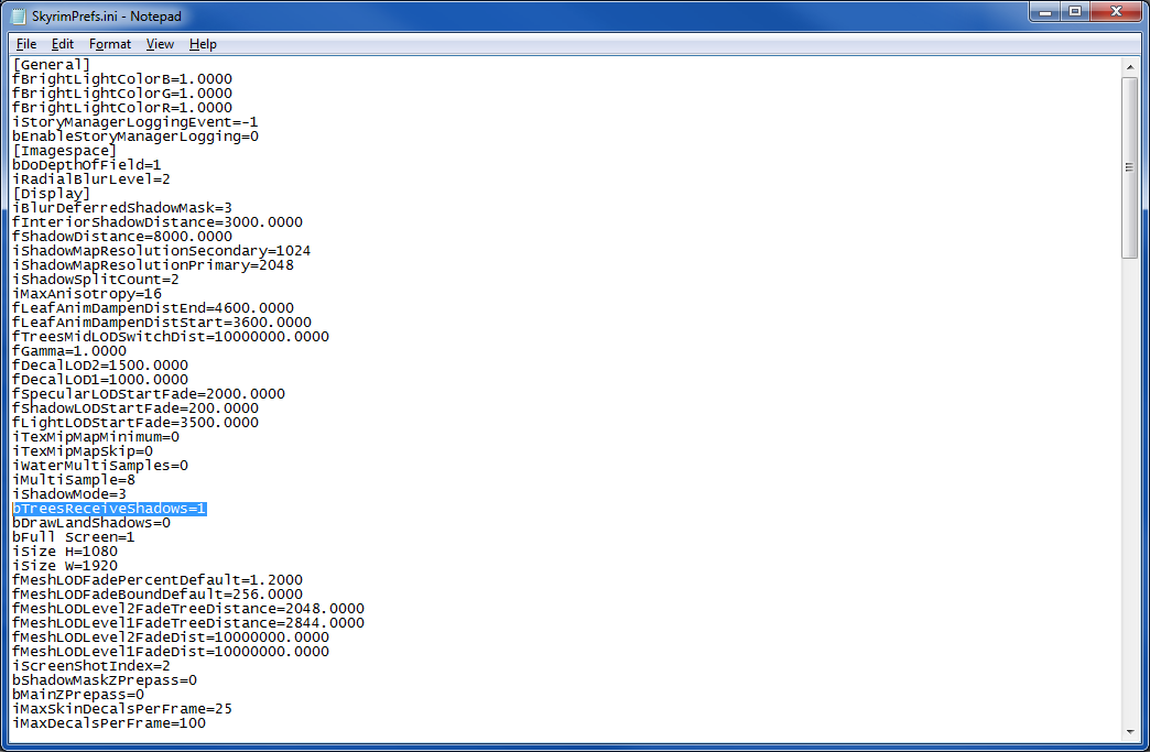 To implement these tweaks open SkyrimPrefs.ini in your My Documents\My Games\Skyrim folder, scroll down to the [Display] section, and implement the following changes (further info about each individual part of this tweak is listed to the right of the setting):
