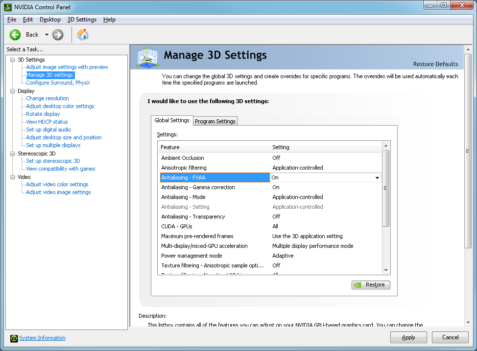 To enable FXAA, open the NVIDIA Control Panel, browse to ‘Manage 3D Settings,’ and either apply FXAA globally to all games through the ‘Global Settings’ tab, or to specific games using the profiles located in the ‘Program Settings’ tab. Please note that if the game already features built-in FXAA, Control Panel FXAA will be automatically disabled.